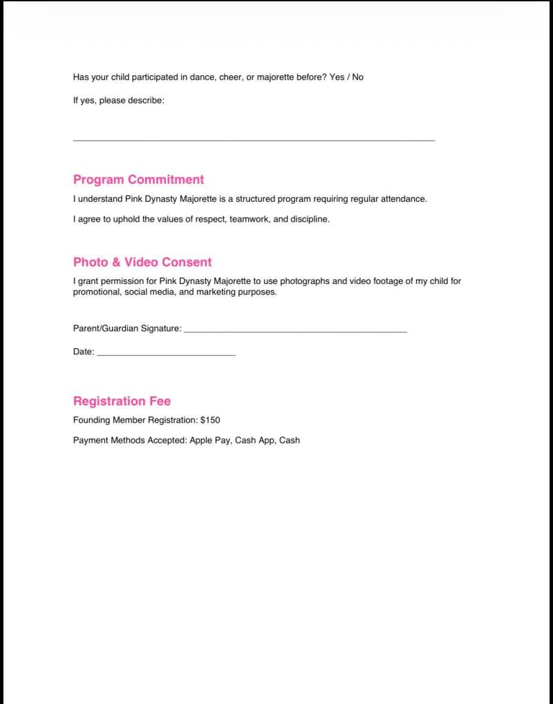 Pink Dynasty Majorette offers more than just dance training — we offer transformation. Your child will gain confidence that carries into all aspects of her life. As a founding member, your daughter becomes part of the beginning of something special, helping shape the culture, standards, and legacy of our program from day one.
